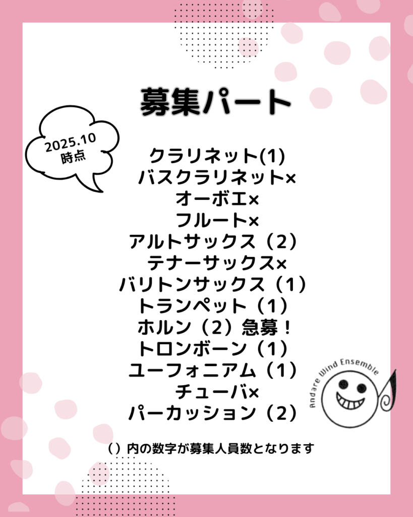 団員募集 2024.08.252025.10.05 団員募集 ただいま新規団員さん募集中です★ 初心者さん、ブランクがある方、子連れでの練習参加もOKです。 是非お問い合わせフォームよりご連絡ください♪